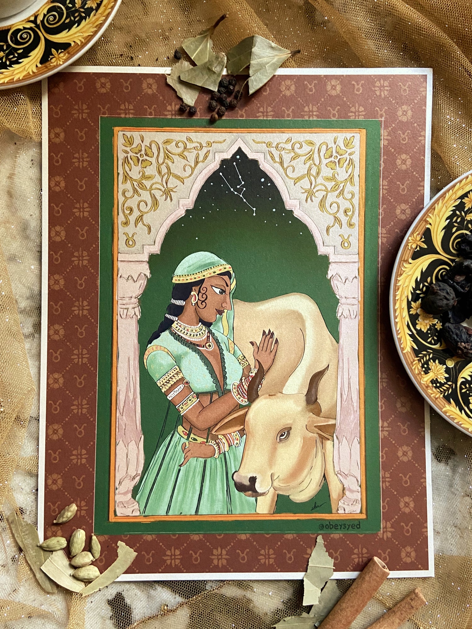 The AstroRani Collection is a celebration of identity, history, and representation. Inspired by the intricate beauty of 16th-century Mughal miniatures, artist Suede reimagines the traditional depictions of South Asian royalty by honoring the true diversity of the region—from deep, rich skin tones to the unique contours of every face.